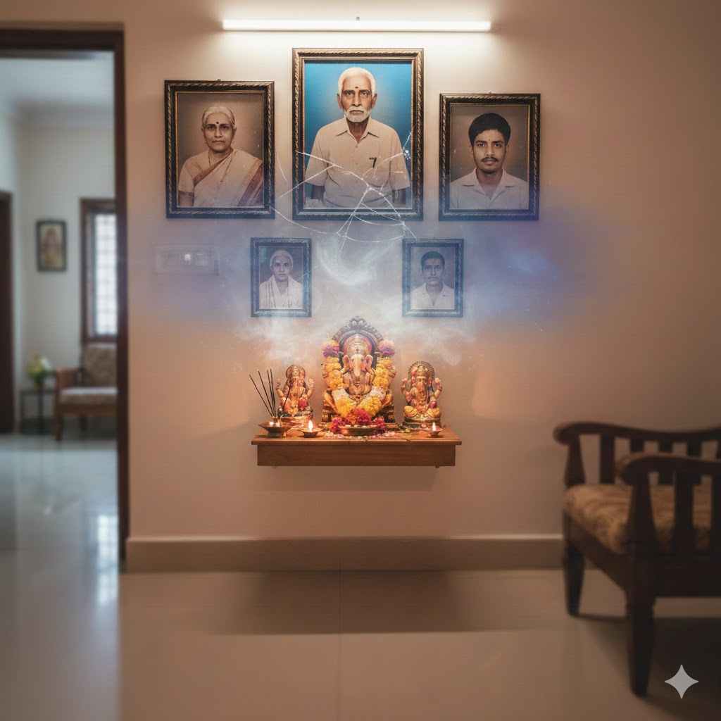 - ದೇವರ ಕೋಣೆ: ಅನೇಕರು ಮೃತರ ಫೋಟೋಗಳನ್ನು ದೇವರ ಚಿತ್ರಗಳ ಜೊತೆಗೆ ಇಡುತ್ತಾರೆ. ಆದರೆ ವಾಸ್ತು ಪ್ರಕಾರ, ದೇವರು ಮತ್ತು ಪಿತೃಗಳು (ಮೃತರು) ಬೇರೆ ಬೇರೆ. ಇಬ್ಬರನ್ನೂ ಒಂದೇ ಕಡೆ ಪೂಜಿಸುವುದು ಶ್ರೇಯಸ್ಕರವಲ್ಲ.